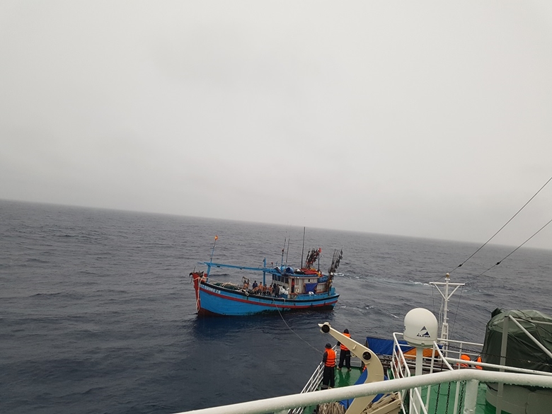 Cụ thể, vào lúc 13 giờ 15 ngày 12/10, nhận được thông tin về tàu cá bị nạn, Vùng 2 Hải quân đã điều động tàu Trường Sa 01 đang thực hiện nhiệm vụ tại khu vực biển DKI nhanh chóng vượt qua điều kiện sóng to, gió lớn tới khu vực Tây Nam nhà giàn DK1/12 (12 hải lý), tiếp cận tàu cá NT-02088TS đang bị hỏng hộp số, trôi dạt trên biển để cứu hộ, cứu nạn.